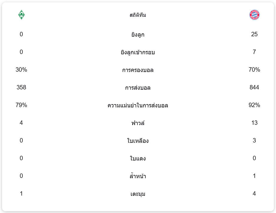 ในแมตช์นี้ บาเยิร์น มิวนิค ครองบอลมากถึง 70% และมีการส่งบอลถึง 844 ครั้ง ความแม่นยำในการส่งบอลอยู่ที่ 92% นอกจากนี้พวกเขายังมีโอกาสยิงถึง 25 ครั้ง โดยยิงเข้ากรอบ 7 ครั้ง ขณะที่ แวร์เดอร์ เบรเมน มีโอกาสยิงเป็นศูนย์ การครองบอลเพียง 30% แสดงให้เห็นถึงความแตกต่างที่ชัดเจนในเกมนี้