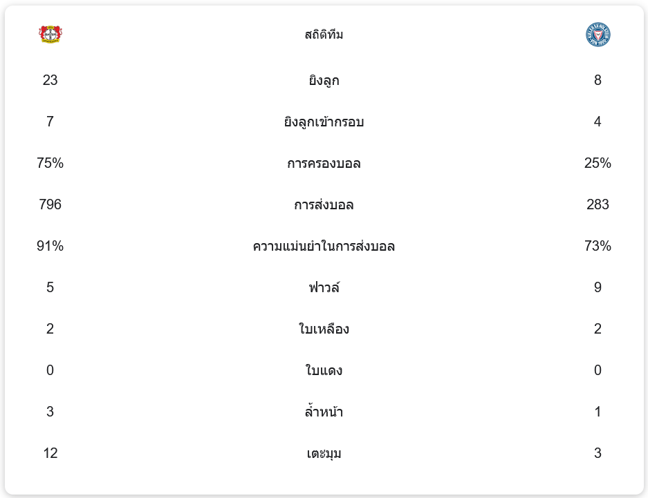 - เลเวอร์คูเซินมีโอกาสยิงทั้งหมด 23 ครั้ง เข้ากรอบ 7 ครั้ง ส่วนโฮลสไตน์ คีลยิง 8 ครั้ง เข้ากรอบ 4 ครั้ง