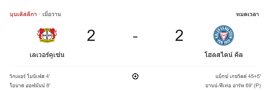 เลเวอร์คูเซิน พลาด 3 แต้มสำคัญ โดน โฮลสไตน์ คีล ไล่ตีเสมอ 2-2 ในศึกบุนเดสลีกา 2024