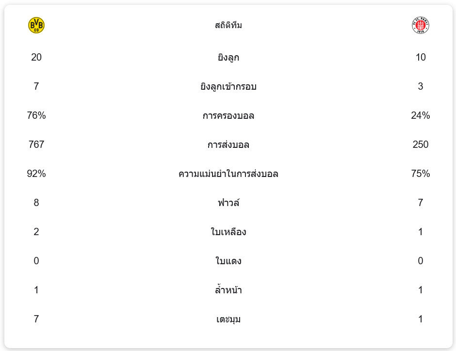 สถิติบุนเดสลีกา 2024 ระหว่าง โบรุสเซีย ดอร์ทมุนด์ 2-1 ซังค์ เพาลี