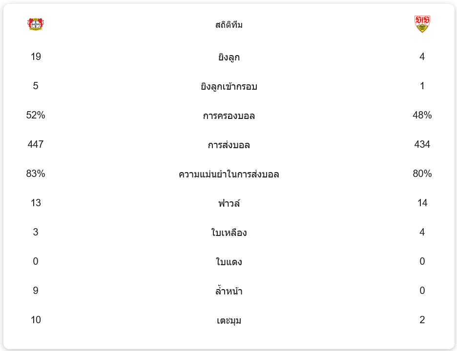 แม้เลเวอร์คูเซินจะมีโอกาสยิงทั้งหมด 19 ครั้ง และยิงเข้ากรอบ 5 ครั้ง ขณะที่สตุ๊ตการ์ตมีโอกาสยิงเพียง 4 ครั้ง และเข้ากรอบแค่ครั้งเดียว ทั้งสองทีมมีการครองบอลที่ใกล้เคียงกัน โดยเลเวอร์คูเซินครองบอลได้ 52% และสตุ๊ตการ์ต 48% อัตราการส่งบอลแม่นยำของเลเวอร์คูเซินอยู่ที่ 83% และสตุ๊ตการ์ตที่ 80% แสดงถึงความสมดุลและการต่อสู้ที่สูสี