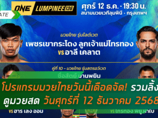 รวมโปรแกรมมวยไทยวันนี้ วันศุกร์ที่ 12 ธันวาคม 2568 อัปเดตตารางชก ONE ลุมพินี พร้อมช่องทางรับชม YouTube/ช่อง 7 และทางเลือกดูผ่าน BANKEELA สำหรับแฟนมวยที่อยากดูมวยไทยและตามผลมวยไทยแบบทันเหตุการณ์