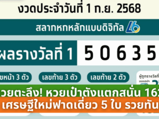 เศรษฐีใหม่เพียบ! ถูกรางวัลที่ 1 สลากดิจิทัล งวด 1 กันยายน 2568 รวม 27 ใบ กวาดเงินรางวัล 162 ล้านบาท คอหวยจับตา เลขเด็ด และแนวทางหวย งวดหน้า ติดตามข่าวหวยล่าสุดที่ บ้านกีฬา