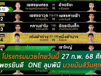 ดูมวยไทยวันนี้ 27 กุมภาพันธ์ ศึกกำปั้นเดือด พร้อมลิ้งก์ดูมวยสด ศึกเพชรยินดี – ONE ลุมพินี – มวยมันส์วันศุกร์