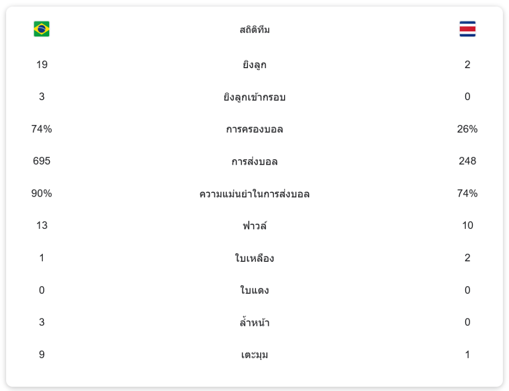แม้จะส่งผู้เล่นตัวหลักลงสนามครบครัน ทั้งวินิซิอุส จูเนียร์, โรดรีโก้ และราฟินญ่า นำแนวรุก พร้อมอลีสซง เบ็คเกอร์ เฝ้าเสา แต่บราซิลก็ไม่สามารถเจาะแนวรับคอสตาริกาที่วางแผนรับมือมาอย่างดีได้
