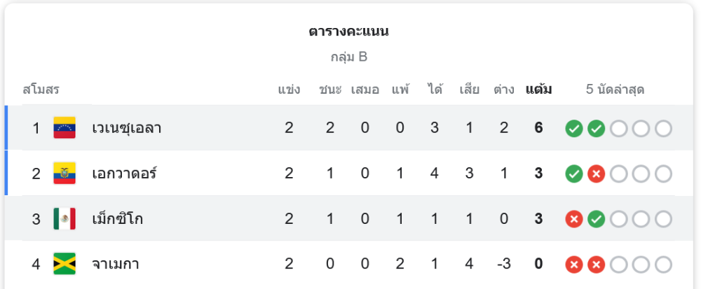 ในการแข่งขันโกปา อเมริกา 2024 โปรแกรมที่สองของรอบแบ่งกลุ่ม กลุ่มบี เมื่อวันที่ 26 มิถุนายน (เช้าวันที่ 27 มิถุนายน ตามเวลาประเทศไทย) คู่แรกเป็นการพบกันระหว่าง เอกวาดอร์ กับ จาเมกา