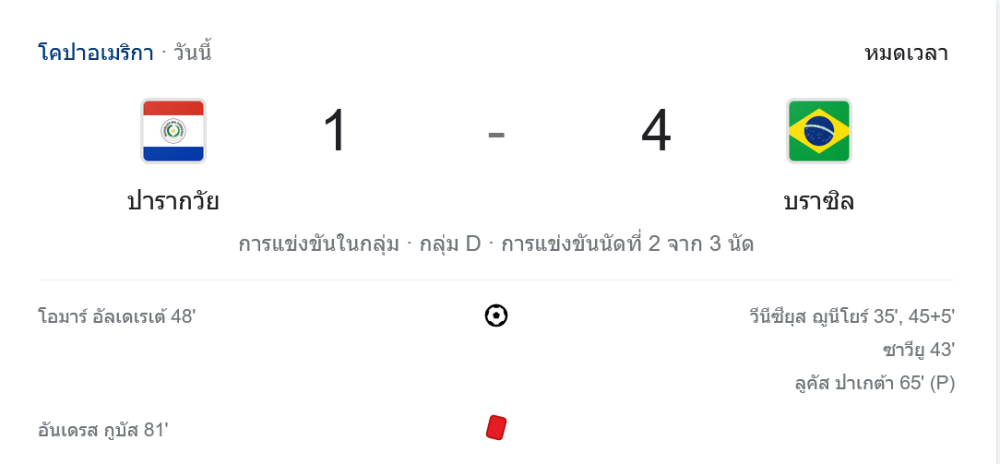 ก่อนจบครึ่งแรกในนาทีที่ 45+5 แนวรับปารากวัยทำพลาดในกรอบเขตโทษ วินิซิอุส จูเนียร์ฉกบอลแล้วส่งเข้าประตูไป บราซิลนำ 3-0