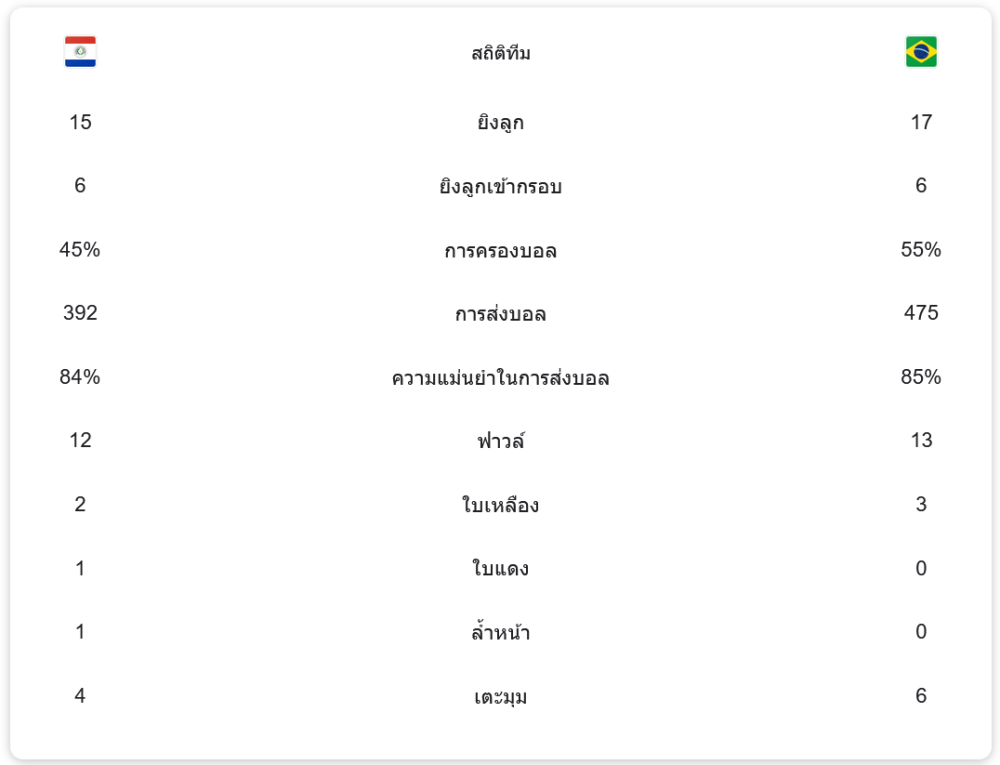 บราซิลคืนฟอร์มโหด ไล่ถลุงปารากวัย 4-1! วินิซิอุส จูเนียร์ ระเบิดฟอร์ม เบิ้ลสองสกอร์ตั้งแต่ครึ่งแรก ขณะที่ปารากวัยต้องเหลือ 10 คนในช่วงท้ายเกม แต่ไม่สามารถเปลี่ยนแปลงผลการแข่งขันได้ ชัยชนะครั้งนี้ทำให้บราซิลมีโอกาสเข้ารอบสูงมาก