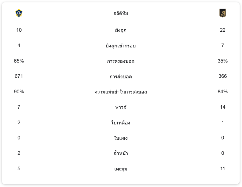 จากสถิติการแข่งขัน แอลเอ กาแลกซี่ ครองบอลได้ถึง 65% และมีการส่งบอลแม่นยำถึง 90% จากการส่งบอลทั้งหมด 671 ครั้ง แต่กลับยิงตรงกรอบเพียง 4 ครั้งจากการยิงทั้งหมด 10 ครั้ง ในขณะที่ ลอส แอนเจลิส เอฟซี ยิงทั้งหมด 22 ครั้ง ตรงกรอบ 7 ครั้ง แม้จะครองบอลได้เพียง 35% แต่กลับทำได้ดีกว่าในการทำประตู