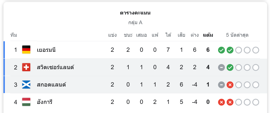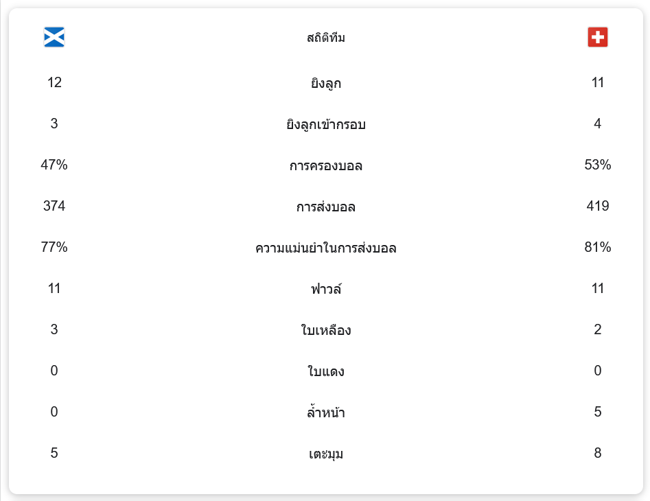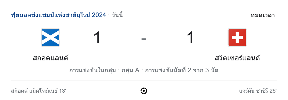 จบเกม สกอตแลนด์ เสมอ สวิตเซอร์แลนด์ 1-1 นัดท้าย สวิตเซอร์แลนด์ ต้องลุ้นเข้ารอบเจอกับ เยอรมนี ขณะที่ สกอตแลนด์ ต้องเน้นชนะ ฮังการี และเชียร์ให้ อินทรีเหล็ก เก็บชัยในวันอาทิตย์ที่ 23 มิถุนายนนี้