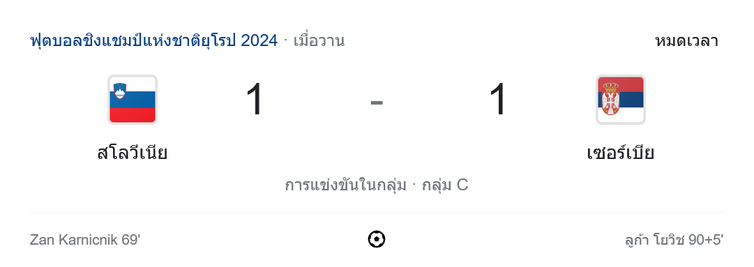 เซอร์เบียรอดตายแบบหวุดหวิด! หลังจาก ซาน คาร์นิชนิค แบ็กขวาของสโลวีเนีย ยิงประตูขึ้นนำที่ทำท่าว่าจะเป็นประตูชัย สุดท้าย ลูก้า โยวิช โขกจากจังหวะเตะมุมช่วงทดเวลา เก็บแต้มแรกในศึกยูโร กลุ่ม ซี