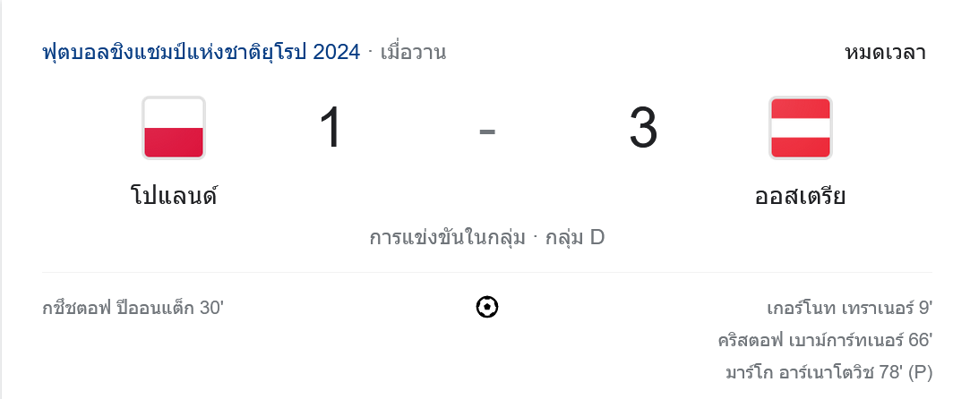 ผลบอลยูโร 2024 โปแลนด์ 1-3 ออสเตรีย กลุ่ม D 22/06/67