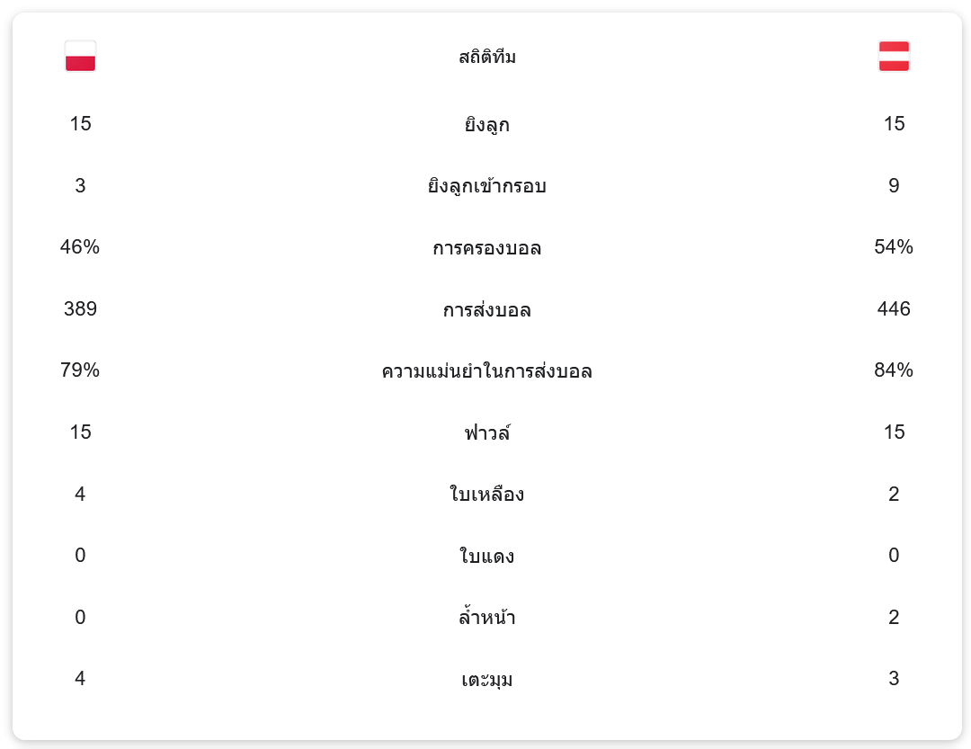 ช่วงทดเจ็บครึ่งแรกนาทีที่ 45+1 บาร์ตอส ซลิส เรียกฟรีคิกระยะ 25 หลา พิโอเตอร์ ซีลินสกี้ ปั่นบอลข้ามกำแพงแต่โดน พาทริค เพนท์ซ ปัดเซฟไว้ได้ จบครึ่งแรก โปแลนด์เสมอออสเตรีย 1-1
