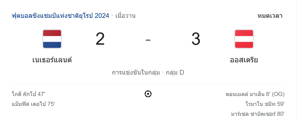 ถ่ายทอดสดฟุตบอลยูโร 2024 กลุ่ม D ทีมชาติเนเธอร์แลนด์ vs ทีมชาติออสเตรีย วันนี้ 26 มิถุนายน 2567 ดูบอลย้อนหลัง คลิปไฮไลท์ ดูบอลยูโร 2024