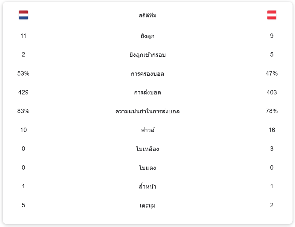 ครึ่งแรกเป็นเกมที่สูสีมาก แม้ “อัศวินสีส้ม” จะพยายามเร่งเครื่องแต่ก็ยังไม่สามารถเจาะแนวรับคู่แข่งได้ จบ 45 นาทีแรก ออสเตรีย นำอยู่ 1-0