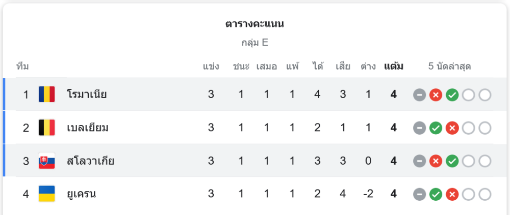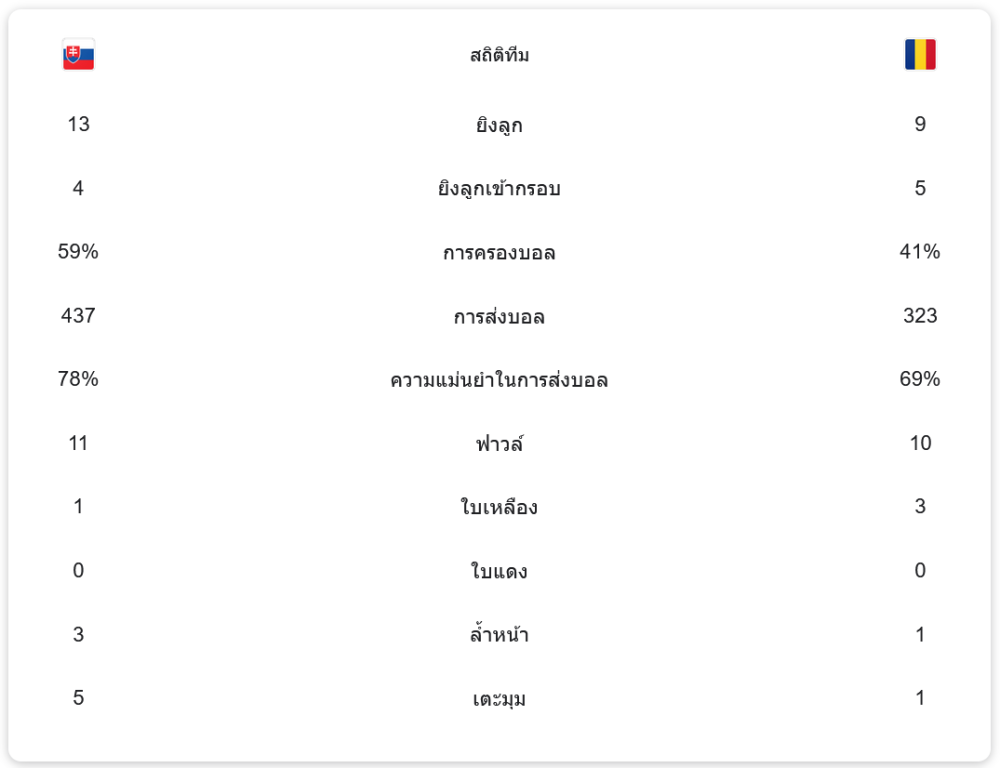 จบเกม โรมาเนีย เสมอ สโลวาเกีย 1-1 โรมาเนียจบการแข่งขันด้วยประตูได้เสียที่ดีกว่า เบลเยียม และคว้าแชมป์กลุ่ม E ไปครอง แม้มี 4 แต้มเท่ากัน ขณะที่ สโลวาเกีย ติดหนึ่งในสี่อันดับสามที่ดีที่สุด