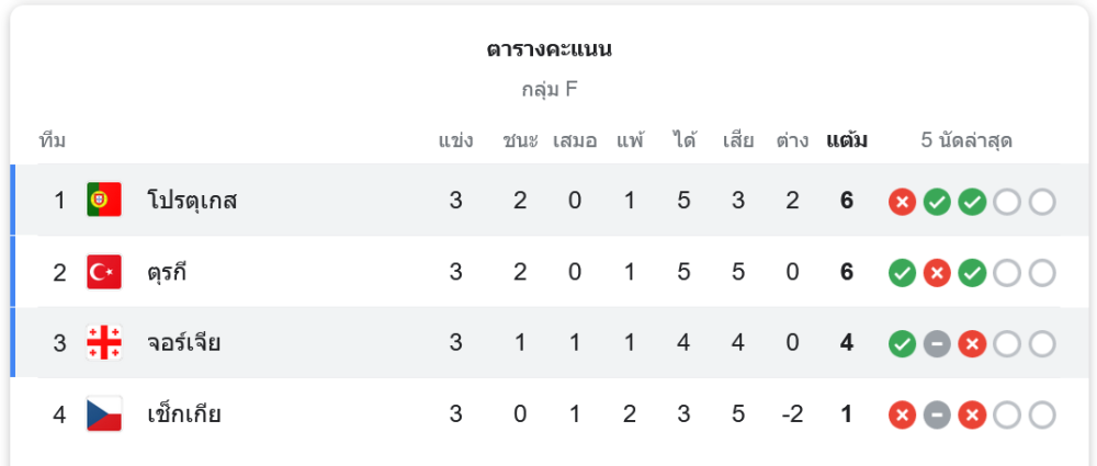 บทสรุปกลุ่ม เอฟ โปรตุเกสคว้าแชมป์กลุ่ม ส่วนตุรกีเข้าป้ายอันดับสอง ควงกันเข้ารอบ 16 ทีมสุดท้าย ขณะที่จอร์เจียที่ได้เข้ามาลุยศึกยูโรครั้งแรก เข้ารอบเช่นกันในฐานะหนึ่งในสี่ทีมอันดับสามที่ผลงานดีสุด ส่วนเช็ก รั้งบ๊วย ไม่ได้ไปต่อ