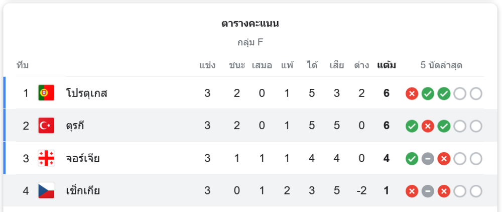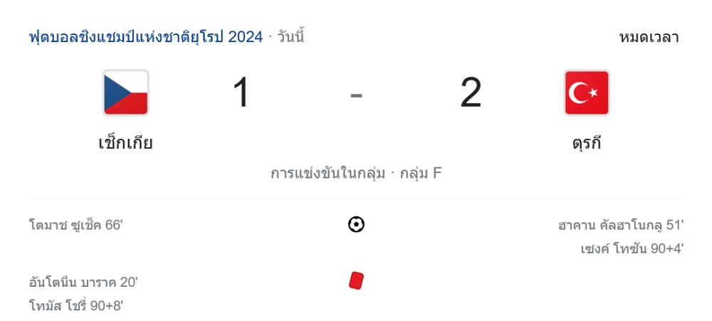 จบเกม ตุรกีชนะ 2-1 เข้ารอบ 16 ทีมสุดท้ายในฐานะรองแชมป์กลุ่มไปพบกับ ออสเตรีย ในวันอังคารที่ 2 กรกฎาคมนี้ ส่วน สาธารณรัฐเช็ก ต้องยุติเส้นทางในยูโร 2024