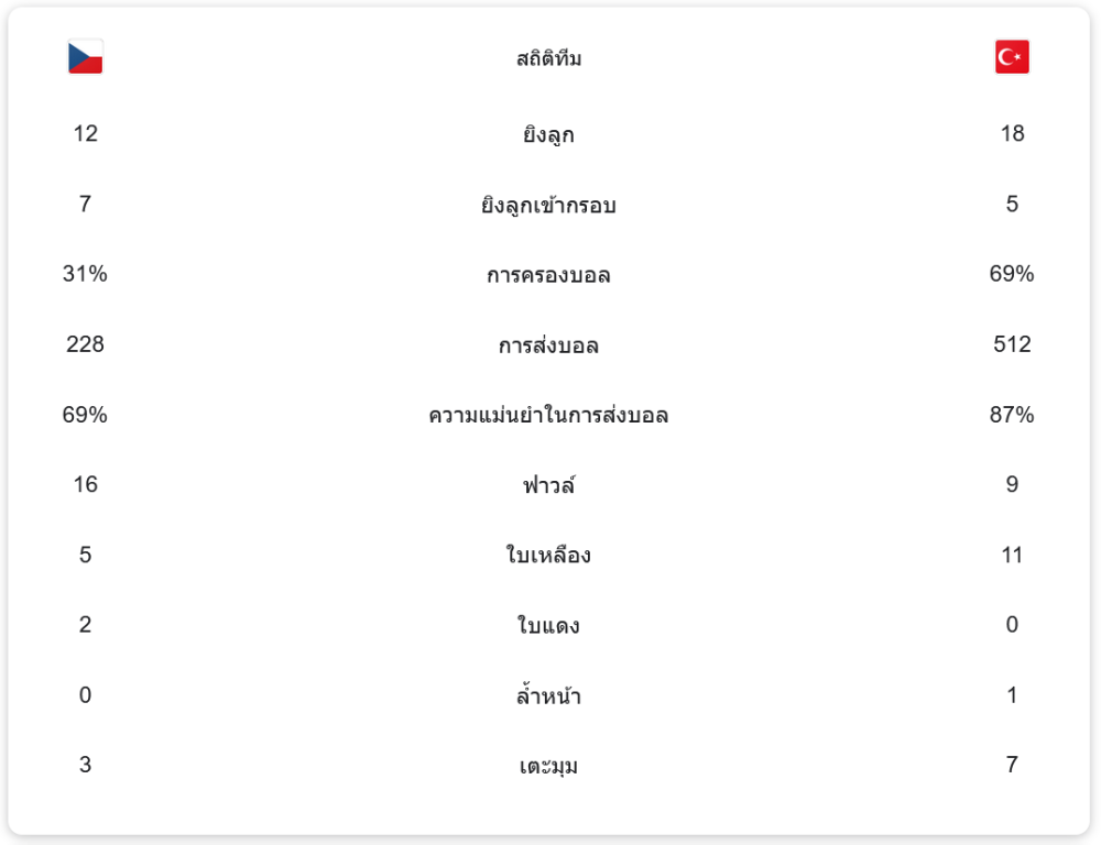 ช่วงทดเจ็บนาทีที่ 90+2 บาริช ยิลมาซ ลากบอลมาหาโอกาสยิง แต่บอลไม่ห่างจาก มาเตย์ โควาร์ นายทวารสำรองเช็กที่ย่อตัวรับได้ แต่ในช่วงทดเจ็บนาทีที่ 90+4 เจง โทซุน หอกสำรองตุรกียิงประตูชัยให้ทีมเอาชนะ 2-1