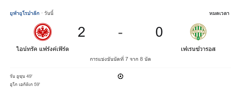 - เตะมุม: แฟร้งค์เฟิร์ต 7 – 2 เฟเรนซ์วารอซี่