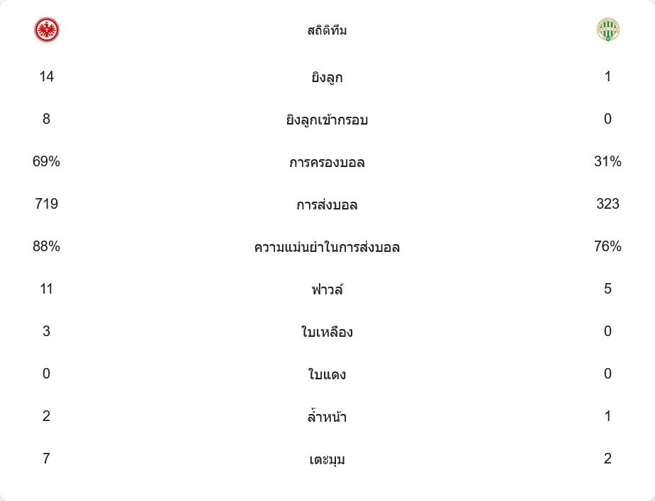 - ยิงเข้ากรอบ: แฟร้งค์เฟิร์ต 8 ครั้ง – 0 ครั้ง เฟเรนซ์วารอซี่