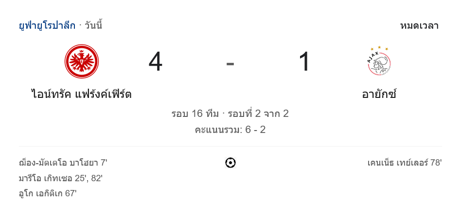 ไอน์ทรัค แฟร้งค์เฟิร์ต แสดงพลังเกมรุกอันดุดัน เปิดบ้านถล่ม อาแจกซ์ อัมสเตอร์ดัม ไปแบบขาดลอย 4-1 รวมผลสองนัด 6-2 คว้าตั๋วเข้าสู่รอบต่อไปของ ยูฟ่ายูโรปาลีก อย่างสมศักดิ์ศรี เกมนี้มีการขับเคี่ยวกันอย่างเข้มข้น โดยเฉพาะในแนวรุกของแฟร้งค์เฟิร์ตที่เล่นกันได้อย่างยอดเยี่ยม ด้าน ผลบอลสด ของคู่นี้เต็มไปด้วยจังหวะตื่นเต้นเร้าใจ และเจ้าถิ่นเป็นฝ่ายครองเกมเหนือกว่าชัดเจน