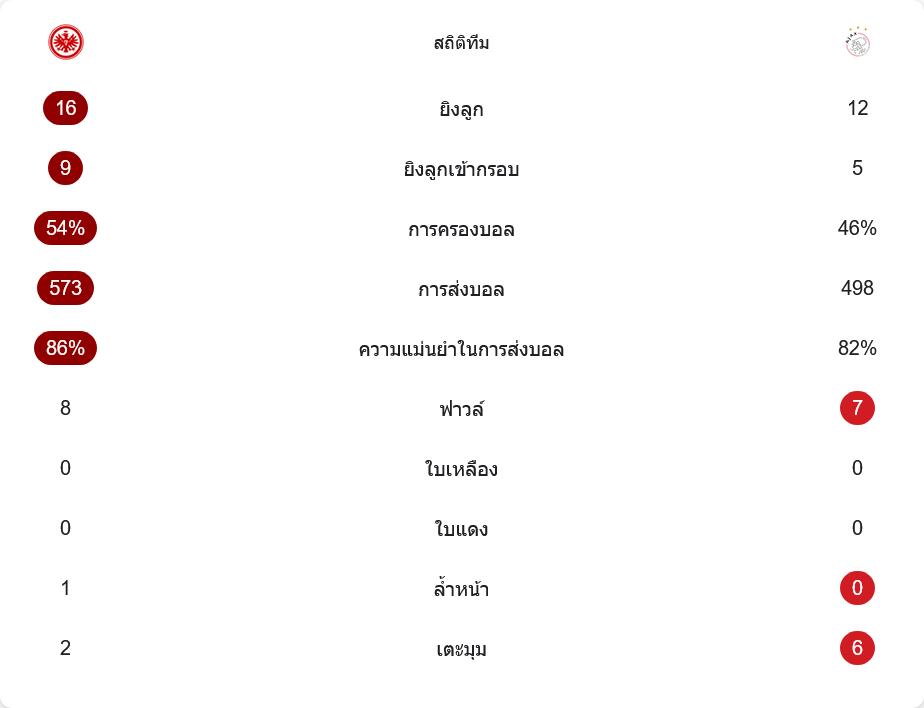เกมนี้ แฟร้งค์เฟิร์ต ครองบอลได้ 54% มีโอกาสยิง 16 ครั้ง เข้ากรอบ 9 ครั้ง เทียบกับ อาแจกซ์ ที่ครองบอล 46% และยิงเข้ากรอบเพียง 5 ครั้ง แสดงให้เห็นถึงความเฉียบขาดของเจ้าบ้านในการจบสกอร์ การจ่ายบอลของแฟร้งค์เฟิร์ตอยู่ที่ 573 ครั้ง ด้วยความแม่นยำ 86% ขณะที่อาแจกซ์จ่ายบอล 498 ครั้ง ความแม่นยำอยู่ที่ 82%