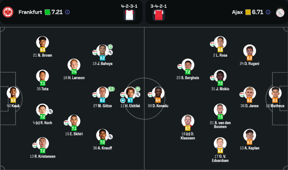 แฟร้งค์เฟิร์ต มาในแผน 4-2-3-1 ซึ่งช่วยให้พวกเขาสามารถครองบอลและเล่นเกมรุกได้อย่างดุดัน การขึ้นเกมทางริมเส้นของ คเนาฟ์ และ บาฮอยา มีประสิทธิภาพสูง ขณะที่การเล่นตรงกลาง เกิทเซ่ คอยคุมจังหวะเกม และ เอกิติเก้ เป็นตัวจบสกอร์ที่เฉียบขาด แผงมิดฟิลด์ยังทำงานได้ดีในเกมรับ ตัดบอลและแย่งครองบอลจากอาแจกซ์ได้หลายครั้ง