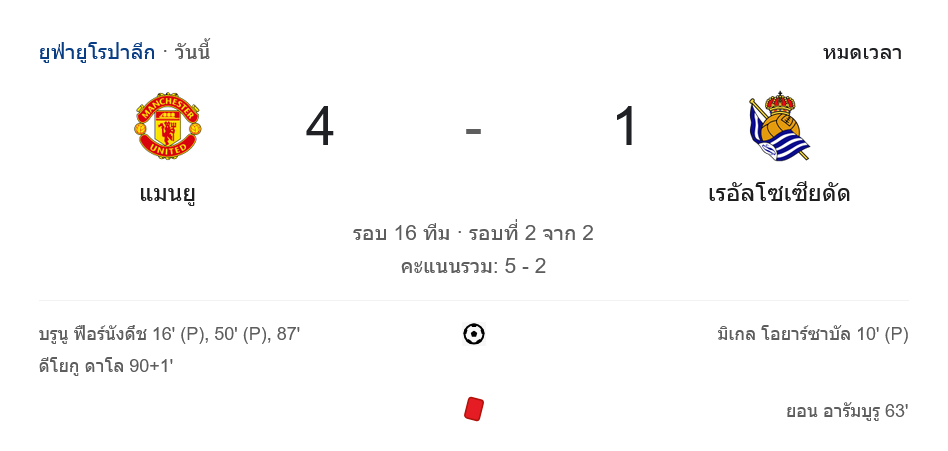 แมนเชสเตอร์ ยูไนเต็ด โชว์ฟอร์มสุดโหด เปิดรังโอลด์ แทรฟฟอร์ด ไล่ถล่ม เรอัล โซเซียดาด ขาดลอย 4-1 รวมผลสองนัด 5-2 ตีตั๋วเข้าสู่รอบต่อไปของ ยูฟ่ายูโรปาลีก ได้อย่างสมศักดิ์ศรี เกมนี้ บรูโน่ แฟร์นันด์ส งัดฟอร์มเทพ กดสองจุดโทษก่อนซัดปิดท้ายให้ทีมคว้าชัยแบบขาดลอย ขณะที่ฝั่งทีมเยือนเสียเปรียบหนักเมื่อ จอน อรัมบูรู โดนใบแดงในนาทีที่ 63 ทำให้สถานการณ์ย่ำแย่กว่าเดิม ก่อนโดนแมนยูลงโทษแบบไร้ปรานี ด้าน ผลบอลสด นัดนี้สะท้อนถึงพัฒนาการที่ยอดเยี่ยมของปีศาจแดง ภายใต้การคุมทีมของ รูเบน อาโมริม