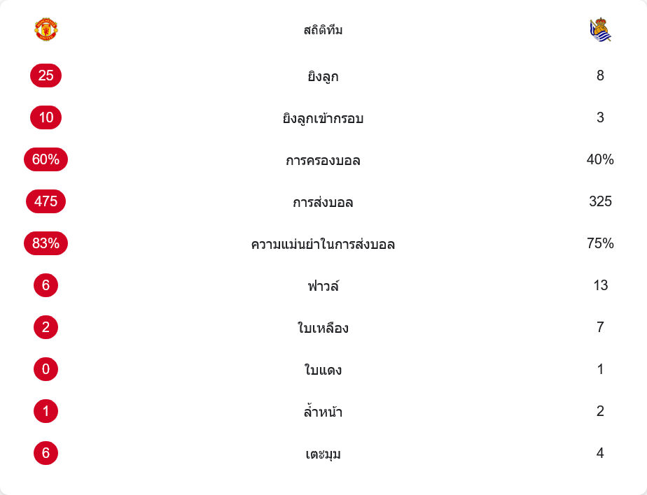 เกมนี้ แมนยู ครองบอลมากถึง 60% และมีโอกาสยิงถึง 25 ครั้ง โดยยิงเข้ากรอบ 10 ครั้ง ขณะที่ เรอัล โซเซียดาด ได้ครองบอลเพียง 40% และมีโอกาสยิงเพียง 8 ครั้ง การผ่านบอลของแมนยูอยู่ที่ 475 ครั้ง ด้วยความแม่นยำ 83% ส่วนโซเซียดาดจ่ายบอล 325 ครั้ง ด้วยความแม่นยำ 75%