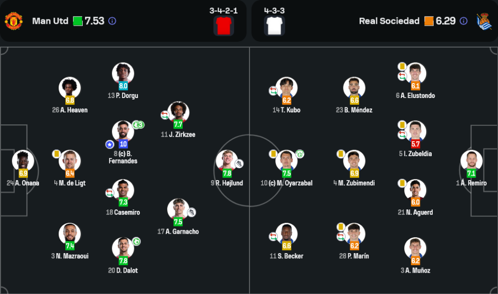 แมนเชสเตอร์ ยูไนเต็ด มาในแผน 3-4-2-1 ซึ่งช่วยให้พวกเขาครองเกมแดนกลางได้เหนือกว่าคู่แข่ง ระบบนี้เปิดโอกาสให้ บรูโน่ แฟร์นันด์ส มีอิสระในการสร้างสรรค์เกมและเป็นตัวหลักในการขึ้นเกมรุก พร้อมกับได้รับการสนับสนุนจาก การ์นาโช่ และ ซิร์คซี ที่ทำให้แนวรับโซเซียดาดเจองานหนัก