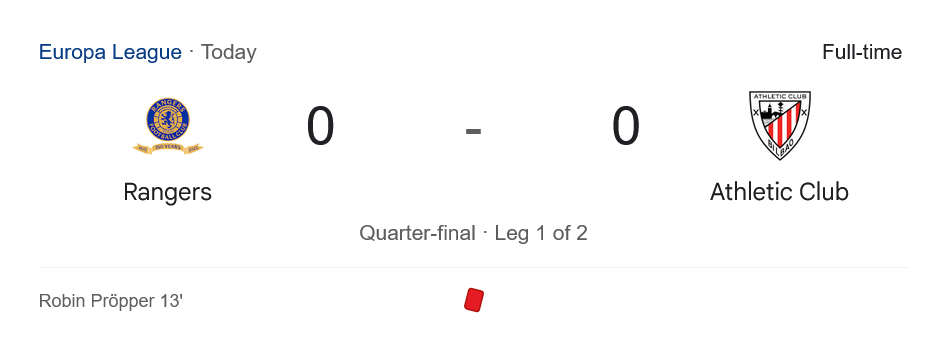การเสมอ 0-0 ในบ้านแม้จะไม่เสียหาย แต่ก็ไม่ได้เปรียบมากนักสำหรับเรนเจอร์ส เพราะเลกที่สองต้องออกไปเยือนบิลเบาในบรรยากาศที่กดดันกว่า ขณะที่ทีมจากสเปนมีโอกาสเก็บชัยในบ้านเพื่อเข้ารอบ แต่ยังเปิดกว้างสำหรับทั้งสองทีม