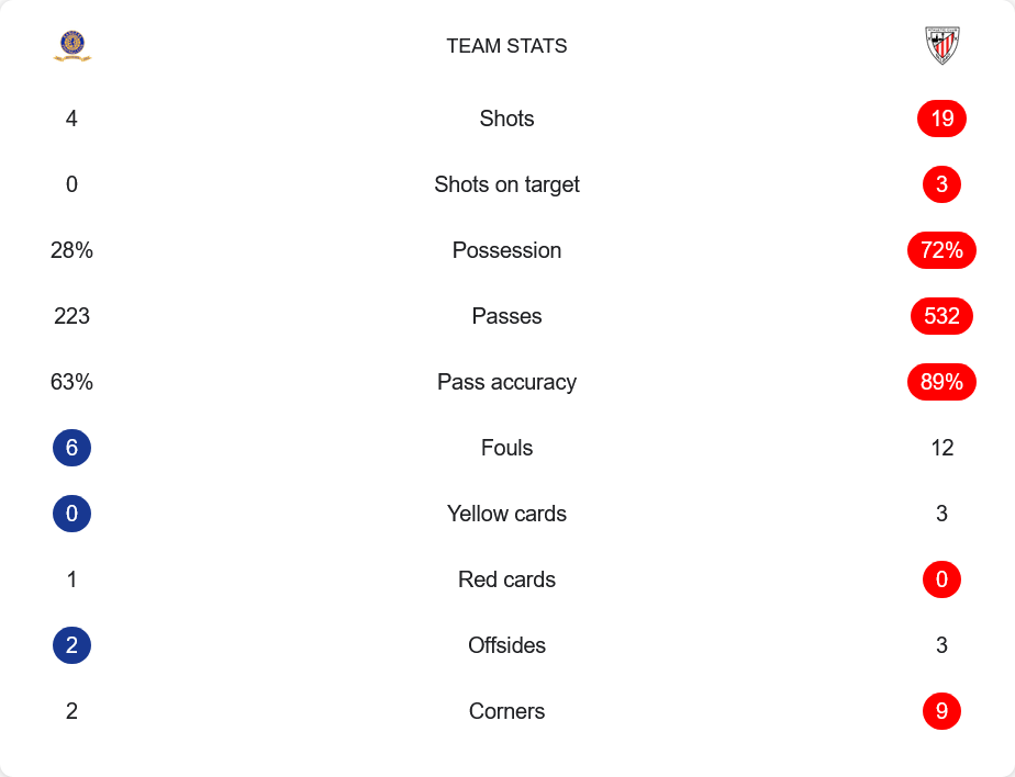 แอธเลติก บิลเบา เหนือกว่าชัดเจนตลอดทั้งเกม โดยครองบอลมากถึง 72% จ่ายบอลได้ถึง 532 ครั้งด้วยความแม่นยำสูงถึง 89% ขณะที่เรนเจอร์สครองบอลได้เพียง 28% และผ่านบอลได้แค่ 223 ครั้ง เกมรุกของเจ้าบ้านยิงได้แค่ 4 ครั้งและไม่ตรงกรอบเลย ส่วนบิลเบายิงถึง 19 ครั้ง เข้ากรอบ 3 ครั้ง ได้เตะมุม 9 ครั้ง เทียบกับเรนเจอร์สแค่ 2 ครั้ง ฟาวล์ใกล้เคียงกันแต่บิลเบาโดนไปถึง 3 ใบเหลือง ส่วนเรนเจอร์สมีใบแดงตั้งแต่นาที 13