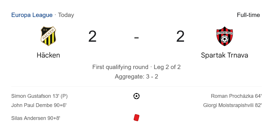 ฮัคเค่นเสมอเกมนี้แต่สกอร์รวม 3-2 พาพวกเขาผ่านเข้าสู่รอบคัดเลือกรอบถัดไปของยูโรปาลีก ส่วนสปาร์ตัคต้องไปลุยยูโรปาคอนเฟอเรนซ์ลีกแทน