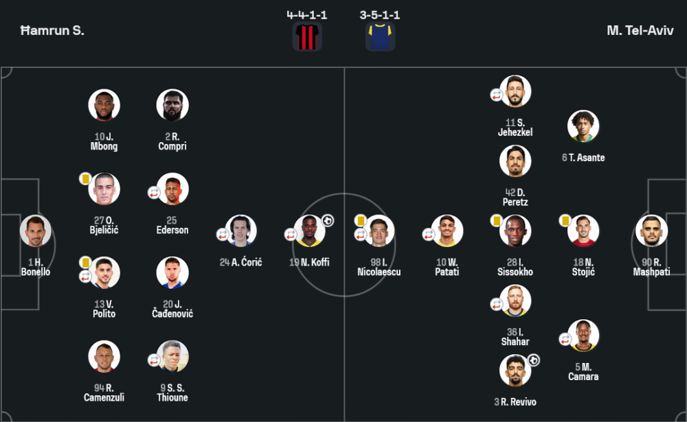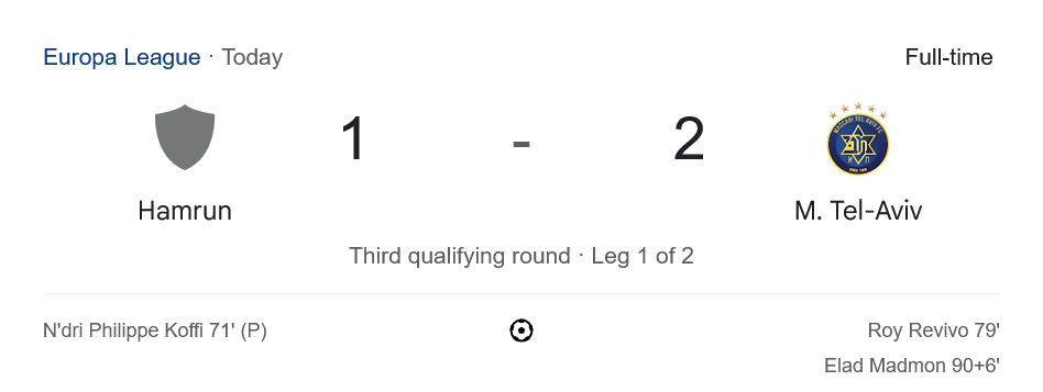 ครึ่งหลัง ความมันเริ่มปะทุในนาทีที่ 71 เมื่อ เอ็นดรี ฟิลิปป์ คอฟฟี่ กองหน้าของเจ้าบ้านซัดจุดโทษพาทีมนำ 1-0 ทำเอาแฟนมอลตาเฮลั่นสนาม แต่ทีมเยือนจากอิสราเอลไม่ยอมง่าย ๆ นาทีที่ 79 รอย เรวิโว่ ซัดตีเสมอ 1-1 ก่อนที่ช่วงทดเจ็บนาที 90+6 เอลาด มัดมอน จะยิงประตูชัยสุดเจ็บปวดให้มัคคาบี้ เทลอาวีฟ บุกแซงชนะ 2-1 แบบช็อกทั้งสนาม ฮัมรุนพยายามโต้กลับแต่ไม่ทันเวลา จบเกมทีมเยือนคว้าชัยพร้อมความได้เปรียบกลับบ้าน
