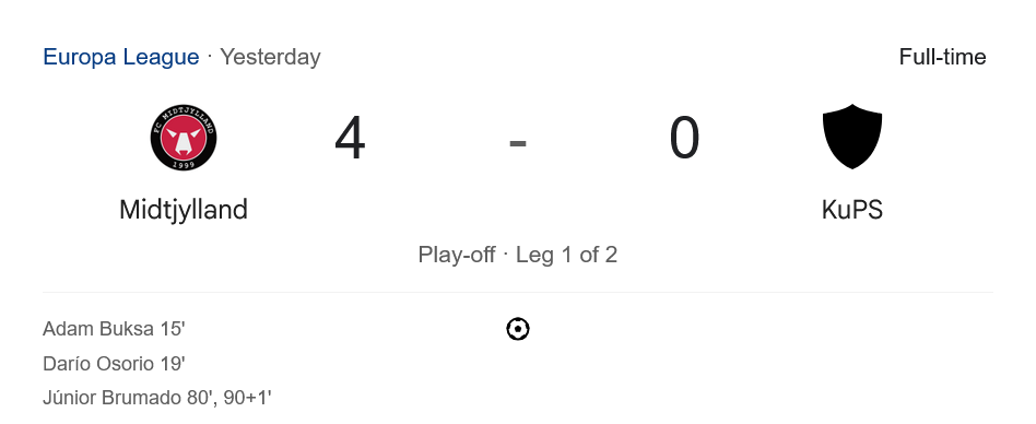 บ้านกีฬาเกาะติดเกมเพลย์ออฟยูฟ่ายูโรปาลีก เลก 1 ที่เดนมาร์ก มิดทิลแลนด์กดคูพีเอส 4-0 แบบไม่ไว้หน้า สัญญาณจาก ผลบอลสด บอกชัด—เจ้าถิ่นคมกริบ จบสกอร์ไม่ปรานี วางแต้มต่อก่อนยกพลไปเยือนเลกสองที่ฟินแลนด์