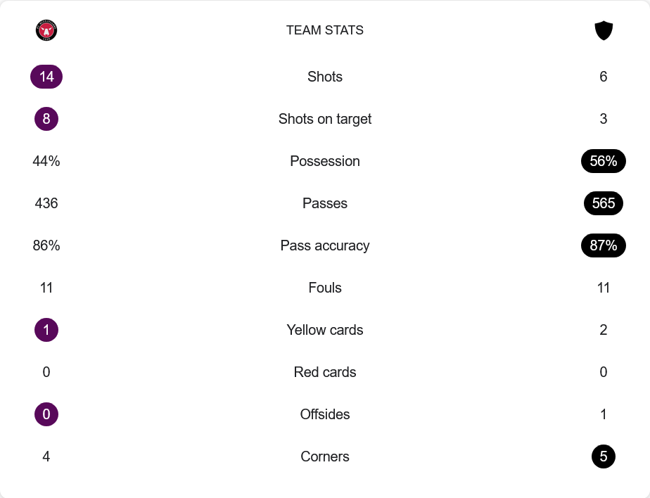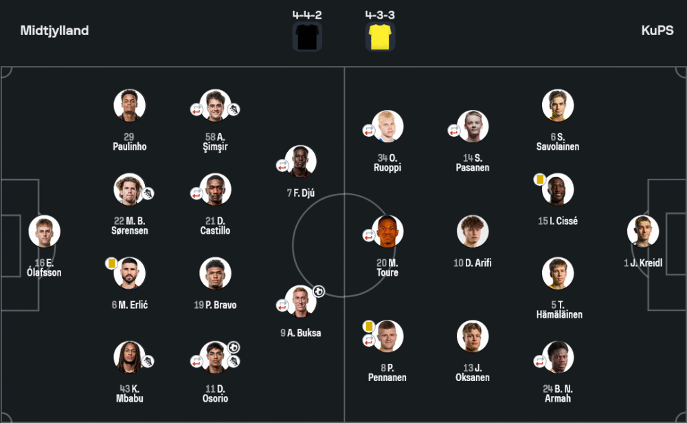 แม้คูพีเอสครองบอลมากกว่า 56% ต่อ 44% และจ่ายบอล 565 ต่อ 436 ครั้ง พร้อมความแม่นยำ 87% เหนือกว่าเจ้าถิ่น 86% แต่ความคมคนละชั้น มิดทิลแลนด์กดทั้งหมด 14 ครั้ง ตรงกรอบ 8 ครั้ง เปลี่ยนเป็น 4 ประตู ส่วนทีมเยือนยิง 6 เข้ากรอบแค่ 3 โอกาส เกมค่อนข้างแฟร์ในเชิงฟาวล์เท่ากันฝั่งละ 11 ครั้ง ใบเหลืองมิดทิลแลนด์ 1 ใบ (เออร์ลิช) คูพีเอส 2 ใบ (ซิซเซ่, เพนนาเนน) ลูกเตะมุมสูสี 4-5 ออฟไซด์คูพีเอสโดน 1 ครั้ง และไม่มีใบแดง