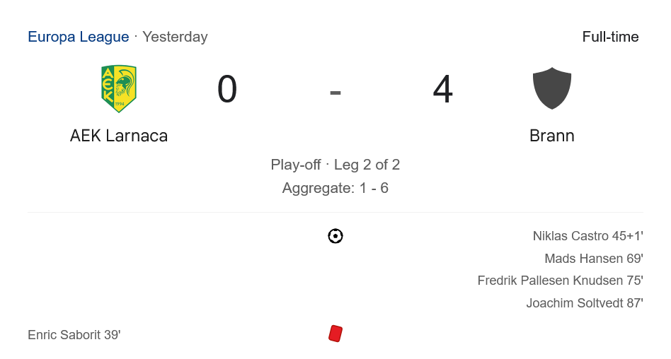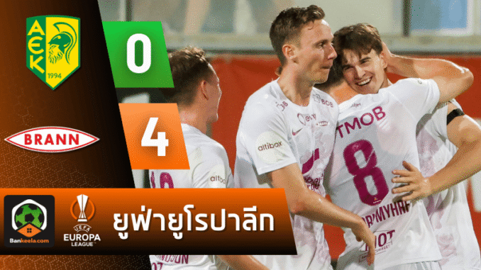 บ้านกีฬาเกาะติด ผลบอลสด เกมเพลย์ออฟ ยูฟ่ายูโรปาลีก เลกสอง ที่ไซปรัส จบด้วยความดุดันของเอสเค บรานน์ ทีมเยือนจากนอร์เวย์ที่เล่นครบเครื่องรุกคมรับแน่น กดสกอร์ 4-0 จาก นิคลาส คาสโตร 45+1’, แมดส์ ฮันเซน 69’, เฟรดริค พัลเลเซ่น คนุดเซ่น 75’ และ โยอาคิม ซอลต์เว็ต 87’ ด้านเจ้าถิ่น AEK ลาร์นากา ต้องเล่น 10 คนตั้งแต่นาที 39 เมื่อ เอ็นริก ซาบอริท โดนไล่ออก ทำให้โมเมนตัมเกมเทไปทางเดียว ชัยชนะนัดนี้ส่งบรานน์เข้ารอบแบ่งกลุ่มด้วยสกอร์รวม 6-1
