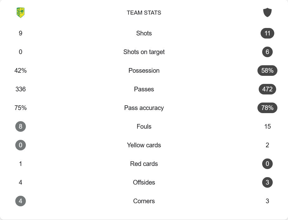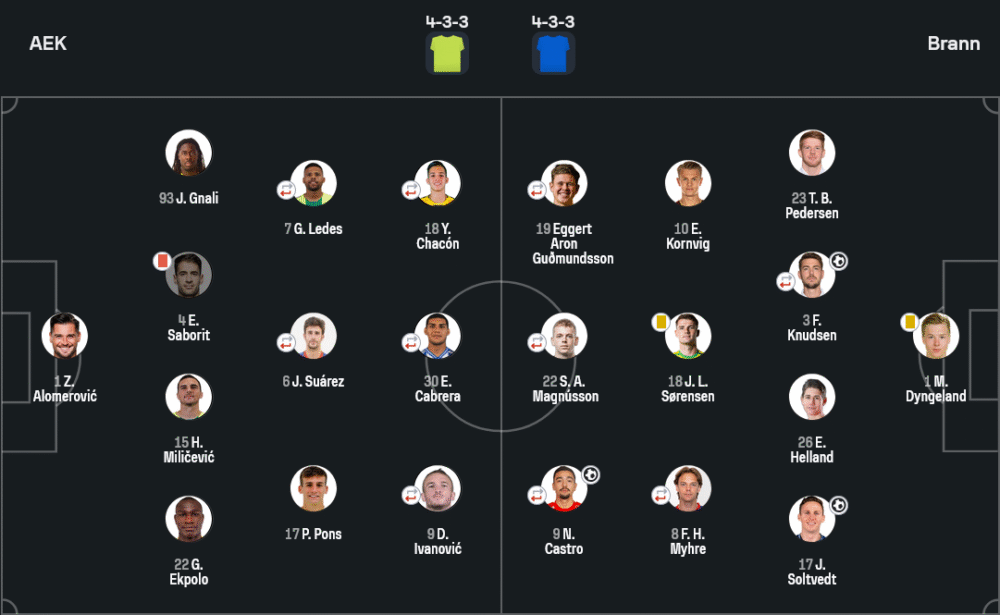 บรานน์คุมเกมด้วยเปอร์เซ็นต์ครองบอล 58% ต่อ 42% โอกาสยิง 11 ครั้ง เข้ากรอบ 6 ครั้ง ขณะที่ AEK ยิง 9 ครั้งแต่ไม่มีบอลตรงกรอบเลย การจ่ายบอลทีมเยือนมากกว่า (472 ต่อ 336) และแม่นยำกว่าเล็กน้อย (78% ต่อ 75%) แม้จะฟาวล์มากกว่า 15 ต่อ 8 แต่ยืนระยะได้ตลอด เกมรับเจ้าถิ่นต้องรับแรงกดดันลูกเซตพีซบ่อยจนกลายเป็นประตูที่สาม นอกจากนี้ AEK ติดกับดักล้ำหน้า 4 ครั้ง ขณะที่บรานน์ 3 ครั้ง คอร์เนอร์ใกล้เคียงกัน 4 ต่อ 3 ทว่า “คุณภาพช็อต” ของทีมเยือนขาดลอย