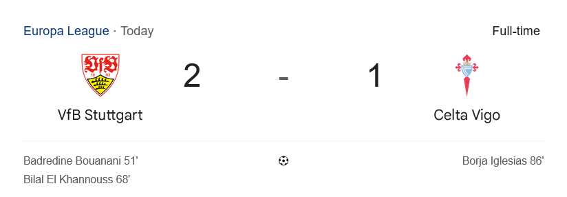 ศึก ยูฟ่ายูโรปาลีก รอบแบ่งกลุ่มคืนวันศุกร์ที่ผ่านมา แฟนบอลได้รับชมเกมสุดเดือดที่สนาม เมอร์เซเดส-เบนซ์ อารีน่า เมื่อเจ้าถิ่น “ม้าขาว” สตุ๊ตการ์ต เปิดบ้านรับการมาเยือนของ เซลต้า บีโก้ จากสเปน ก่อนจบเกมด้วยชัยชนะของเจ้าถิ่น 2-1 พร้อมคว้า 3 แต้มประเดิมกลุ่มอย่างสุดมันส์ โดย บ้านกีฬา เก็บ ผลบอลสด และข้อมูลเชิงลึกหลังเกมมาฝากอย่างละเอียด