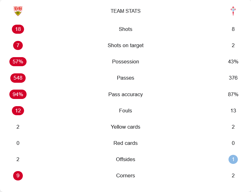 ตลอดเกม สตุ๊ตการ์ต ยิงรวม 18 ครั้ง เข้ากรอบ 7 ครั้ง ครองบอล 57% ต่อบอล 548 ครั้ง ความแม่นยำ 94% ส่วนทีมเยือน เซลต้า บีโก้ มีโอกาสยิง 8 ครั้ง เข้ากรอบเพียง 2 ครองบอล 43% และจ่ายบอล 376 ครั้ง ความแม่นยำ 87% เกมนี้เจ้าบ้านทำฟาวล์น้อยกว่า (12 ต่อ 13) ได้เตะมุมถึง 9 ครั้ง แสดงให้เห็นถึงความกดดันที่สร้างต่อแนวรับคู่แข่ง