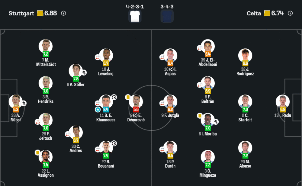 บิลาเอล เอล คานนุสส์ (Bilal El Khannouss) มิดฟิลด์ตัวรุกของ สตุ๊ตการ์ต คว้ารางวัล Man of the Match ด้วยคะแนน 8.4 ยิง 1 แอสซิสต์ 1 มีส่วนร่วมสำคัญในทุกจังหวะรุก สร้างโอกาสหลายครั้ง และเป็นหัวใจของเกมรุกในนัดนี้