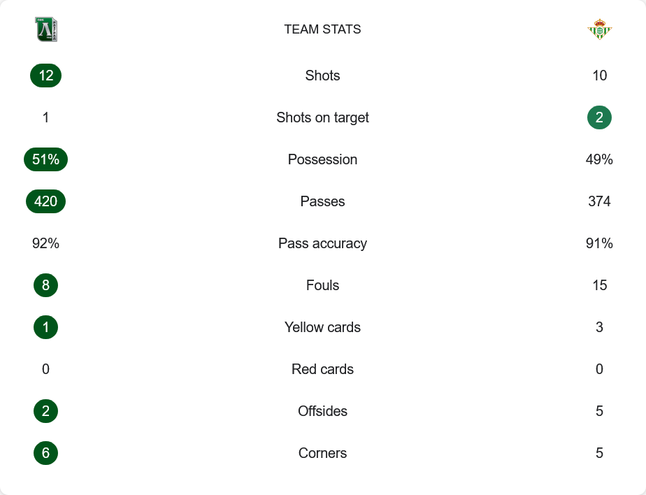 จาก บ้านผลบอล เกมนี้ลูโดโกเร็ตส์ครองบอลได้ 51% เทียบกับเบติส 49% จ่ายบอลมากถึง 420 ครั้ง ความแม่นยำ 92% ขณะที่เบติสจ่าย 374 ครั้ง แม่นยำ 91% ยิงทั้งหมด 12 ต่อ 10 ครั้ง แต่เจ้าบ้านเข้ากรอบแค่ 1 ส่วนเบติสเข้ากรอบ 2 และเปลี่ยนเป็นประตูทั้งสองลูก ฟาวล์ 8 ต่อ 15, ใบเหลือง 1 ต่อ 3, เตะมุม 6 ต่อ 5 สะท้อนความเฉียบคมของทีมเยือนที่ใช้โอกาสไม่เปลืองเลย