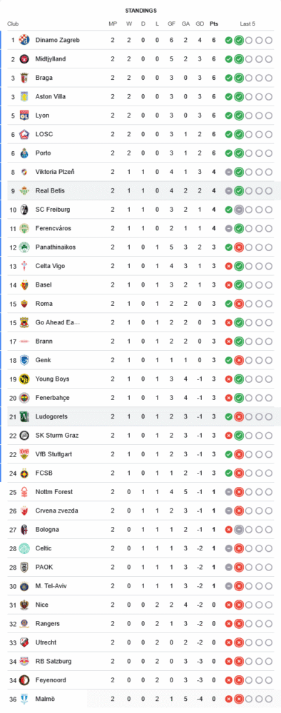 หลังจบเกมนี้ เรอัล เบติส เก็บ 3 แต้มสำคัญ เพิ่มเป็น 4 คะแนนจาก 2 นัด รั้งอันดับ 9 ของกลุ่มรวมในตาราง ยูฟ่า ยูโรปาลีก มีลุ้นเข้ารอบต่อไปอย่างเต็มตัว ขณะที่ ลูโดโกเร็ตส์ ยังมีเพียง 1 แต้มจาก 2 นัด อยู่อันดับ 21 ต้องเร่งฟอร์มหากหวังผ่านเข้ารอบ