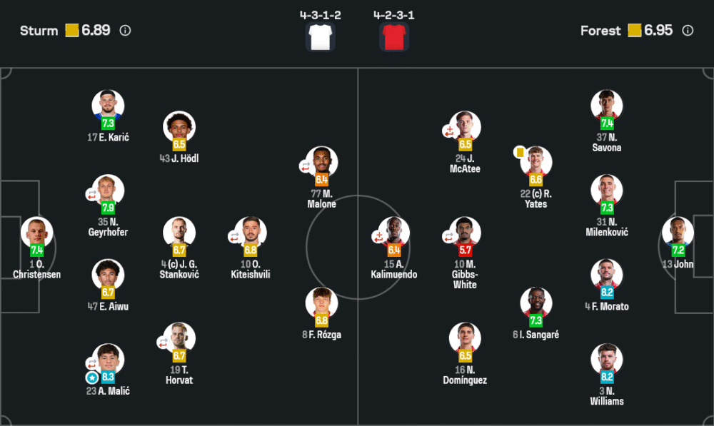 ทั้งเกม Malić ดวลกับ Savona และ Kalimuendo ตลอดเวลา แต่แทบไม่เสียท่าเลย เขาอ่านจังหวะทแยงตัดบอลได้บ่อยมาก ช่วยสกัดลูกครอสอันตรายหลายครั้ง แถมยังมีจังหวะเติมสูงขึ้นไปเปิดบอลให้เพื่อนลุ้นในเขตโทษอยู่เรื่อย ๆ เรียกว่าทั้งรุกทั้งรับทำได้ครบสูตร หากไม่มีเขา ฟอเรสต์อาจเจาะฝั่งขวาของสตวร์มได้สักลูก
