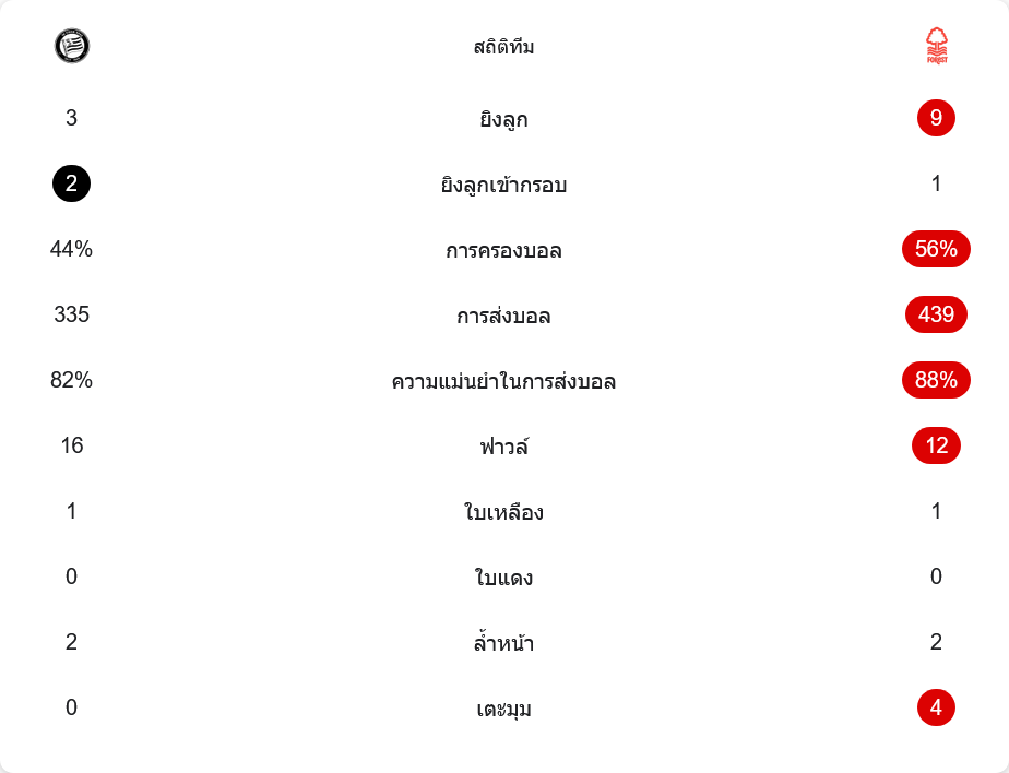 ตัวเลขบนกระดานชี้ชัดว่า ฟอเรสต์ทำได้ดีกว่าบางจุด แต่สกอร์ไม่ขยับ สตวร์มยิงเพียง 3 ครั้ง แต่เข้ากรอบถึง 2 ลูก แสดงว่าทุกจังหวะยิงเลือกกันอย่างระมัดระวัง ขณะที่ฟอเรสต์ใส่เต็ม ยิงไป 9 ครั้ง ทว่าบอลเข้ากรอบเพียง 1 ครั้ง เพราะส่วนใหญ่ถูกบีบให้ยิงไกลหรือโดนบล็อกก่อน