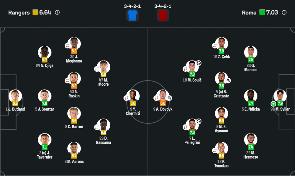 ตำแหน่ง Man of the Match จาก Sofascore ตกเป็นของ ไมล์ สวิลาร์ นายทวารโรม่า ที่ได้คะแนนสูงถึง 7.9 บ้านกีฬาเห็นด้วยเต็ม ๆ เพราะแม้เรนเจอร์สจะไม่ได้บุกถาโถม แต่ทุกจังหวะยิงเข้ากรอบ สวิลาร์ยืนตำแหน่งได้ดี เซฟลูกยากให้กลายเป็นงานง่าย รวมถึงการออกมาตัดบอลโด่งหลายครั้งที่ช่วยลดความกดดันให้แนวรับ นอกจากนั้นยังมีส่วนสำคัญในการเริ่มเกมรับเป็นรุกด้วยการออกบอลสั้นให้กองหลังต่อเกมขึ้นไปอย่างมั่นใจ ทำให้โรม่าเล่นไหลลื่นตั้งแต่หลังถึงหน้า