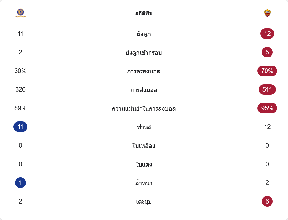 ตัวเลขสะท้อนภาพเกมชัดเจน โรม่าเป็นฝ่ายครองบอลถึง 70% เทียบกับเรนเจอร์สที่มีเพียง 30% เท่านั้น ทีมเยือนผ่านบอลตลอดทั้งเกม 511 ครั้ง ความแม่นยำสูงถึง 95% ส่วนเจ้าถิ่นผ่านบอล 326 ครั้ง ความแม่นยำ 89%