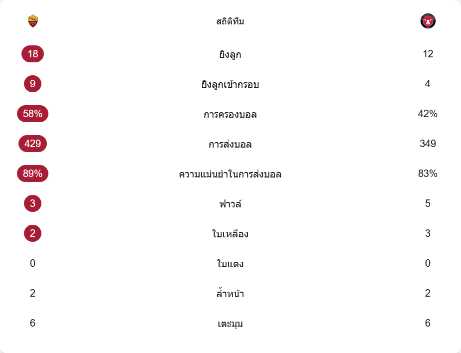 ตัวเลขในเกมนี้สะท้อนชัดว่าโรม่าคุมเกมได้มากกว่า เจ้าถิ่นยิงทั้งหมด 18 ครั้ง เข้ากรอบถึง 9 ครั้ง ส่วนทีมเยือนยิง 12 ครั้ง เข้ากรอบ 4 ครั้ง การครองบอลเป็นของโรม่า 58% ขณะที่มิดทิลแลนด์ได้ 42% การผ่านบอลเจ้าบ้านทำได้ 429 ครั้ง ความแม่นยำสูงถึง 89% ส่วนทีมเยือนผ่านบอล 349 ครั้ง ความแม่นยำ 83% เกมนี้แทบไม่มีการอัดกันหนักมาก ตัวเลขฟาวล์โรม่าแค่ 3 ครั้ง มิดทิลแลนด์ 5 ครั้ง ใบเหลืองโรม่า 2 ใบ ทีมเยือน 3 ใบ ไม่มีใบแดง ล้ำหน้าฝั่งละ 2 ครั้ง และเตะมุมเท่ากันที่ 6 ครั้ง แสดงให้เห็นว่าแม้โรม่าเหนือกว่าในเชิงรูปเกม แต่ทีมเยือนก็สู้กันด้วยมาตรฐานสูงและมีโอกาสตอบโต้ไม่น้อย