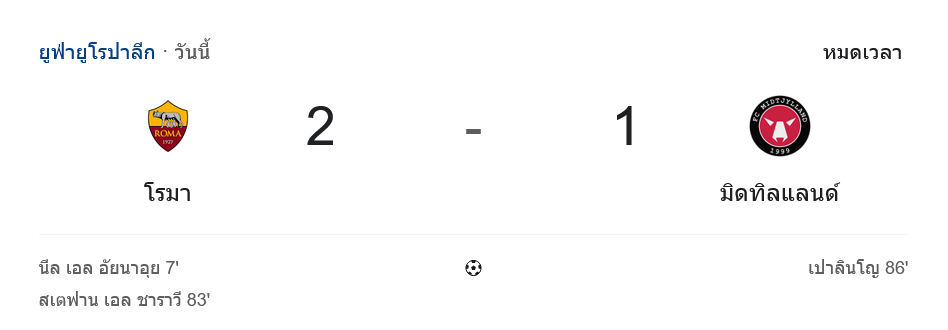 จาก : ผลบอลสด ยูฟ่ายูโรปาลีก ระหว่าง เอเอส โรม่า 2-1 มิดทิลแลนด์ วันนี้ 28/11/68 – บ้านกีฬา